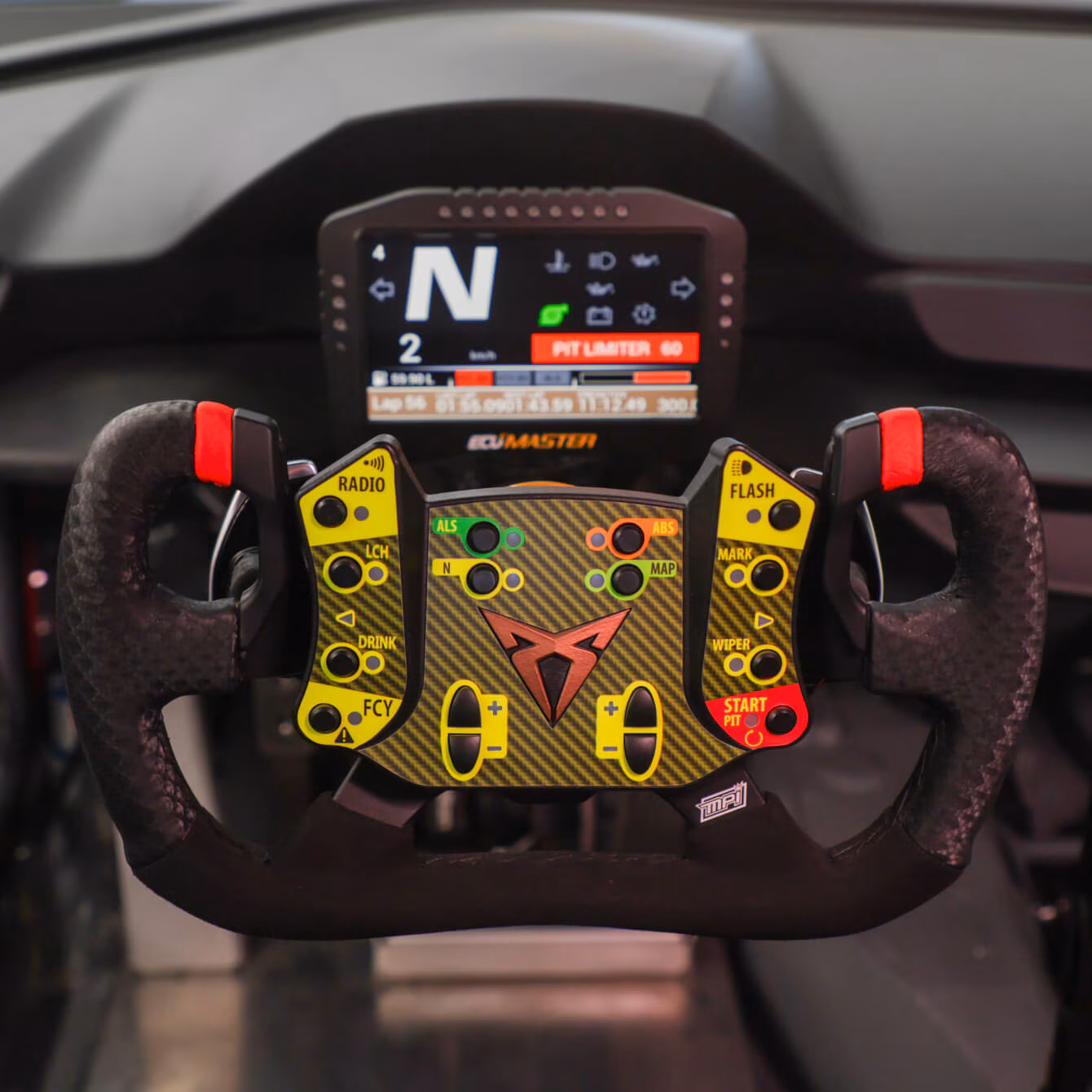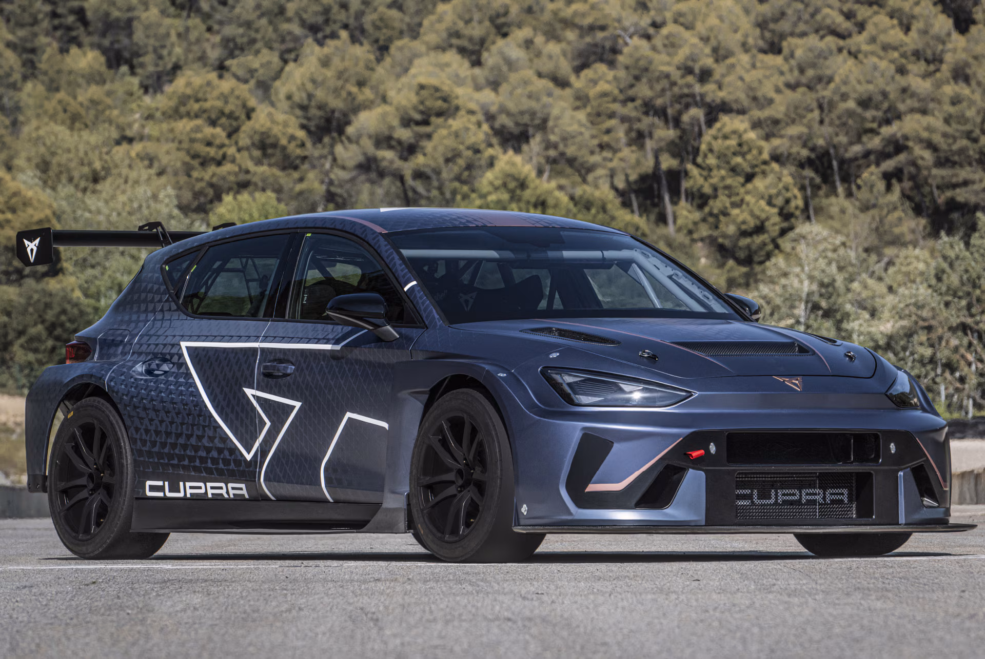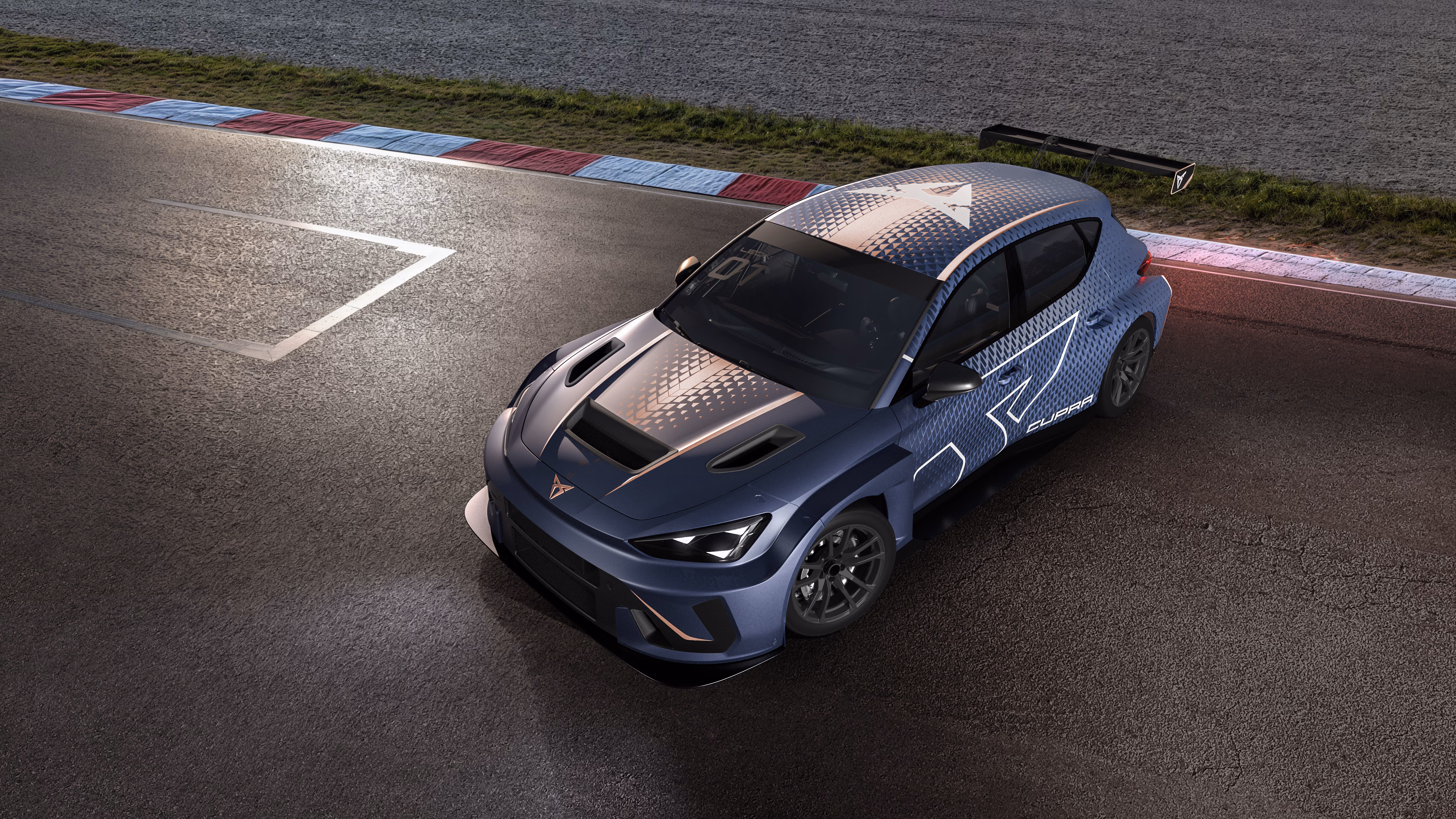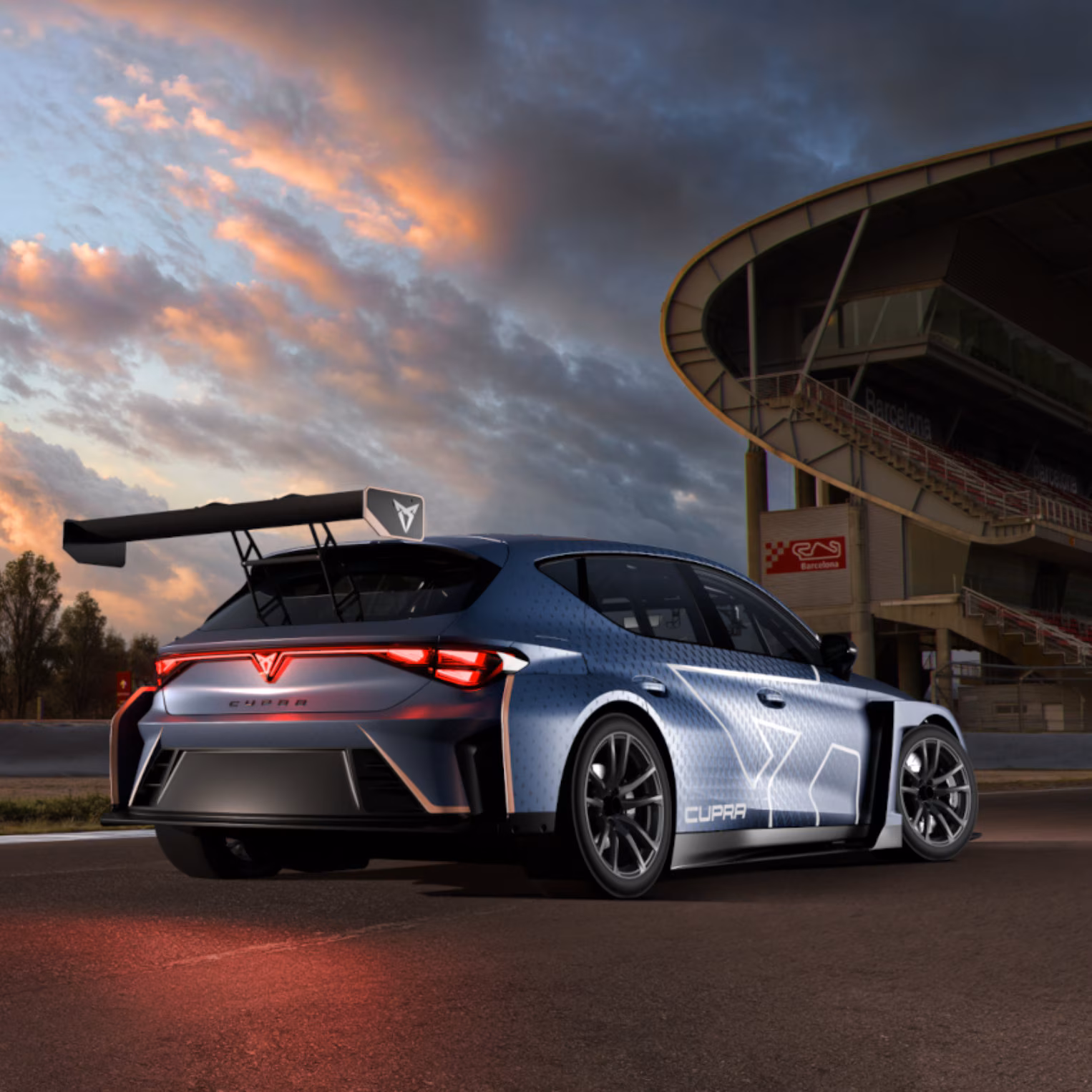 L’ambiance rend hommage aux versions de course TCR. On retrouve des baquets avant CUPBuck, des ceintures à quatre points et un numéro de série gravé au laser sur le panneau de porte. Le kit aérodynamique est complet: aileron de toit, splitters, bas de caisse, diffuseur. S’ajoutent un logo CUPRA chromé foncé sur le capot, des coques de rétroviseurs en fibre de carbone noire et un graphisme spécifique du logo le long du flanc.