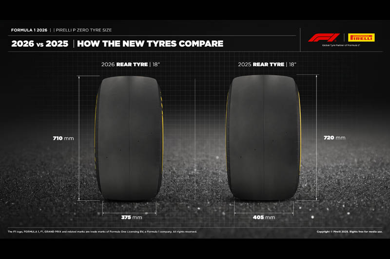 Les dimensions des pneus évoluent pour s’adapter aux futures monoplaces et à la nouvelle réglementation. Le diamètre de jante reste fixé à 18 pouces, mais la bande de roulement est réduite: 25 mm de moins à l’avant et 30 mm à l’arrière. Le diamètre total diminue également, de 15 mm à l’avant et 10 mm à l’arrière. Ces choix doivent mieux correspondre aux caractéristiques des nouvelles voitures, tout en conservant un équilibre global similaire.