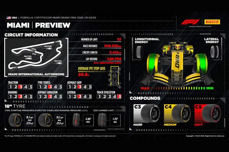 Pour ce Grand Prix de Miami F1, Pirelli met à disposition les trois composés les plus tendres de sa gamme : C3, C4 et C5. Un choix cohérent avec le profil du circuit. L’asphalte, refait en 2023, reste marqué par une faible rugosité et gagne progressivement en grip au fil des séances, à mesure que la trajectoire se gomme.